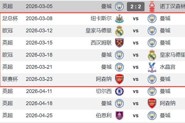 曼城丢分已经接近丢冠,这还没完?瓜迪奥拉的球队接下来还有魔鬼赛程,16天5赛,全是恶战,将三连客对阵纽卡斯尔、皇马和西汉姆联,纽卡斯尔是主场龙,刚击败了阿斯顿维拉;皇马在欧冠或许就是玄学加身;西汉姆联是为保级而战;接着就是欧冠主场对阵皇马以及月底与阿森纳争夺联赛杯冠军的决赛,连续5场比赛都是硬仗。